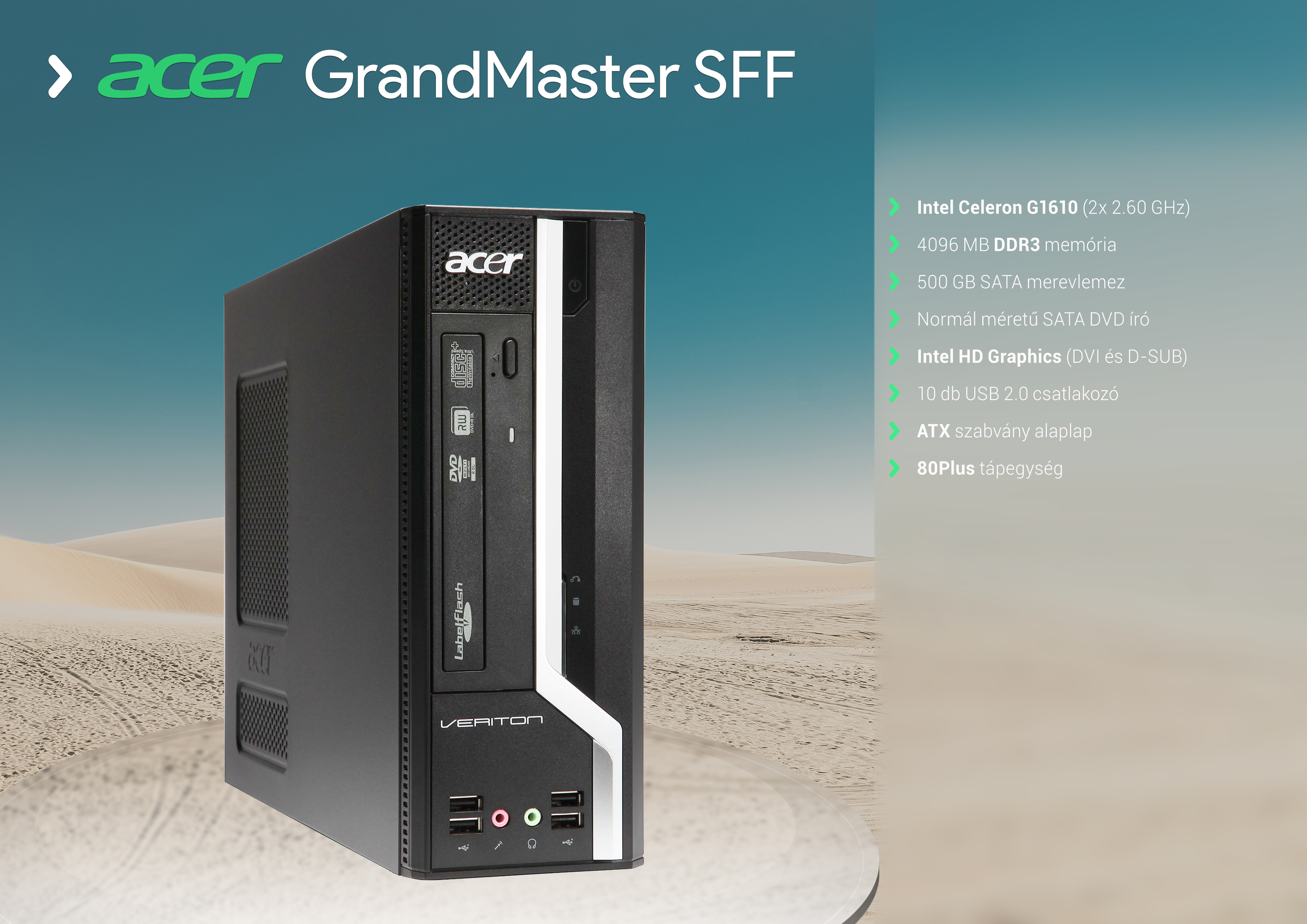 Intel Celeron G1610 2.60 GHz sebességű processzor, 4096 MB DDR3 memória (1066-1600 MHz) memória, 500 GB SATA3 merevlemez, normál méretű SATA DVD író optikai meghajtó, Intel H61 chipset, ezüst-fekete Fekvő számítógépház