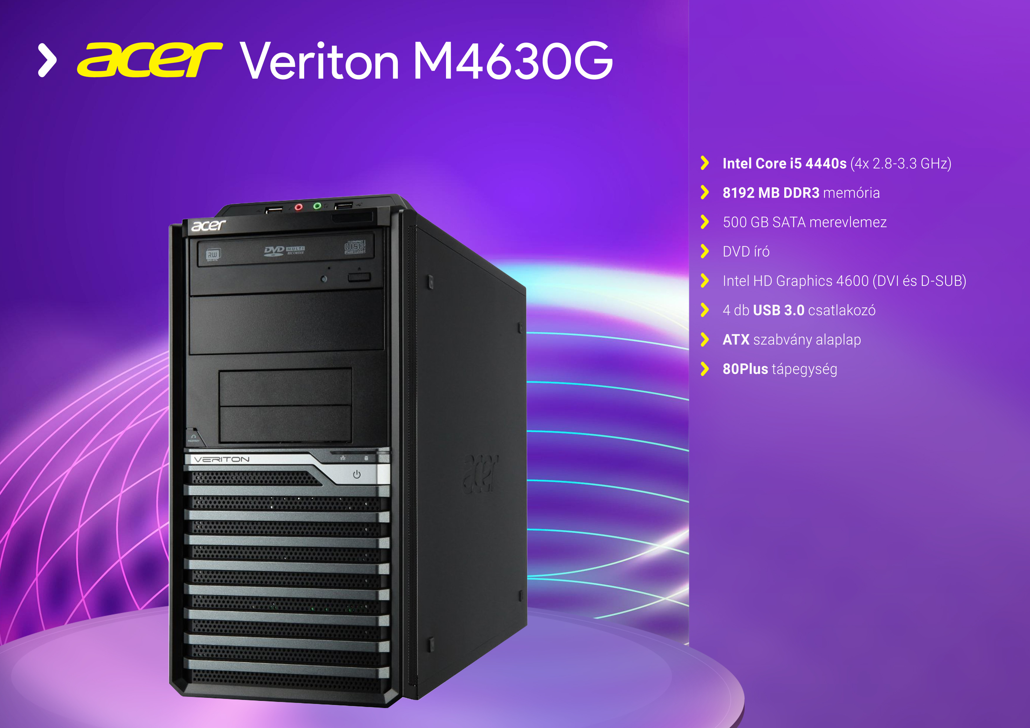 Intel Core i5 4440s 2.80 GHz sebességű processzor, 8192 MB DDR3 memória (1066-1600 MHz) memória, 500 GB SATA3 merevlemez, normál méretű SATA DVD író optikai meghajtó, Intel B85 Express chipset, számítógépház