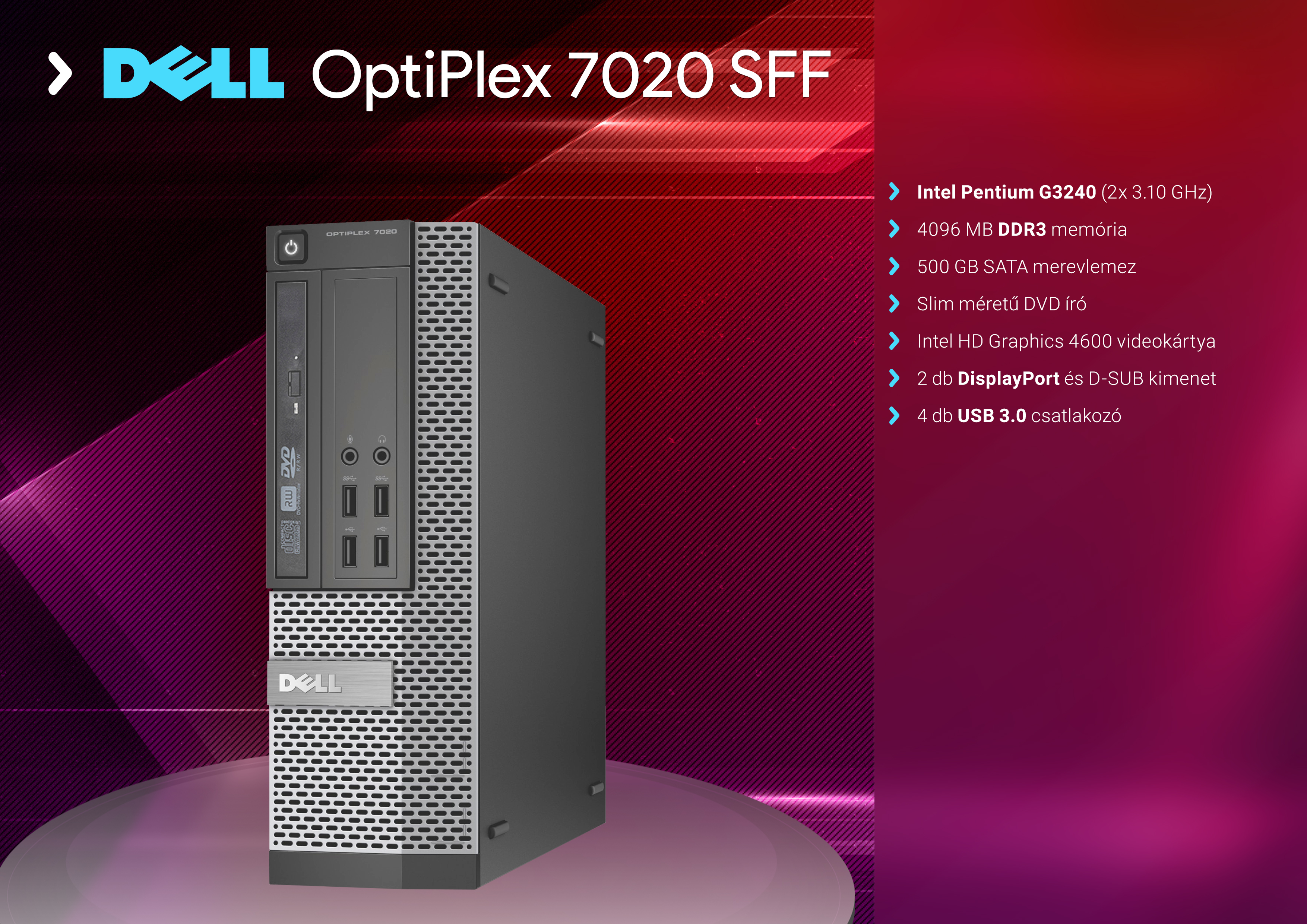 Intel Pentium G3240 3.10 GHz sebességű processzor, 4096 MB DDR3 memória (1066-1600 MHz) memória, 500 GB SATA merevlemez, slim méretű SATA DVD író optikai meghajtó, Intel Q87 Express chipset, fekete Fekvő számítógépház